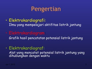 EKG merupakan pemeriksaan penting untuk mendiagnosis penyakit jantung dengan merekam aktivitas listrik jantung. EKG memberikan informasi mengenai irama jantung, konduksi listrik jantung, dan kelainan struktural jantung.