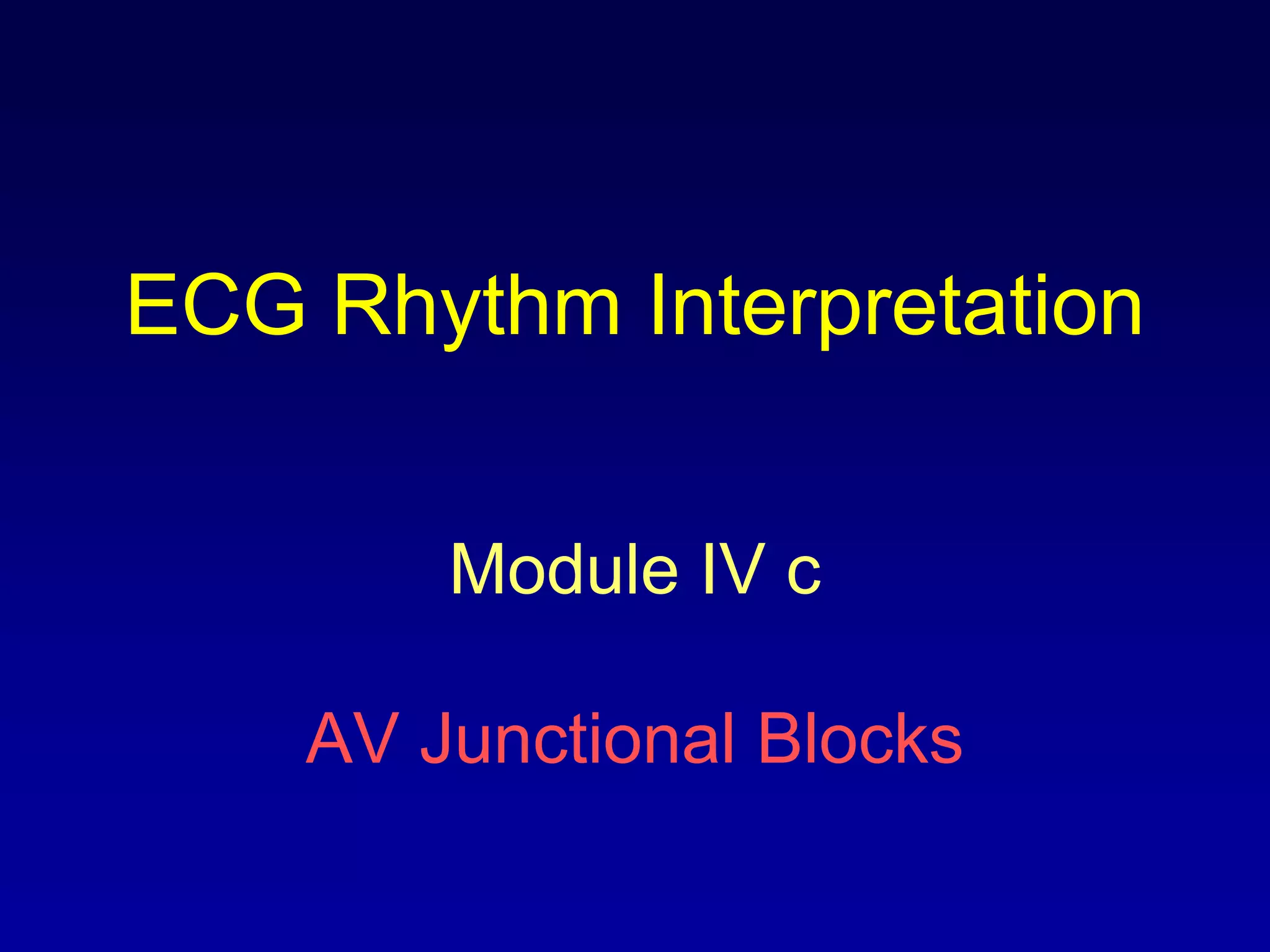 This document provides an overview of AV junctional blocks, including first, second, and third degree blocks. It defines each type of block, describes how they deviate from normal sinus rhythm, and provides their etiologies. Rhythms illustrating each type of block are presented along with their interpretations. It is intended to teach the reader how to recognize and understand different types of AV junctional blocks.