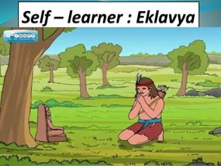 The document analyzes Eklavya as a tragic hero, highlighting his noble ambition to learn archery despite being denied by Guru Drona due to caste discrimination. Eklavya's self-study leads him to surpass Arjuna in archery, yet his ultimate sacrifice of severing his own thumb as guru dakshina symbolizes his tragic fate. Ultimately, Eklavya's story critiques societal hierarchies and illustrates how a common man's aspirations can lead to suffering and tragedy.