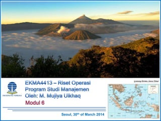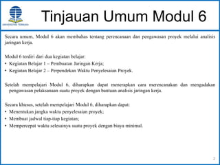 Modul 6 membahas perencanaan dan pengawasan proyek menggunakan analisis jaringan kerja melalui dua kegiatan belajar. Tujuannya adalah agar peserta dapat menentukan waktu penyelesaian, membuat jadwal, dan mempercepat proyek dengan biaya minimal. Konsep utama yang digunakan adalah jalur kritis yang menentukan waktu penyelesaian proyek dan diagram jaringan yang menunjukkan hubungan antara aktivitas dalam suatu proyek.