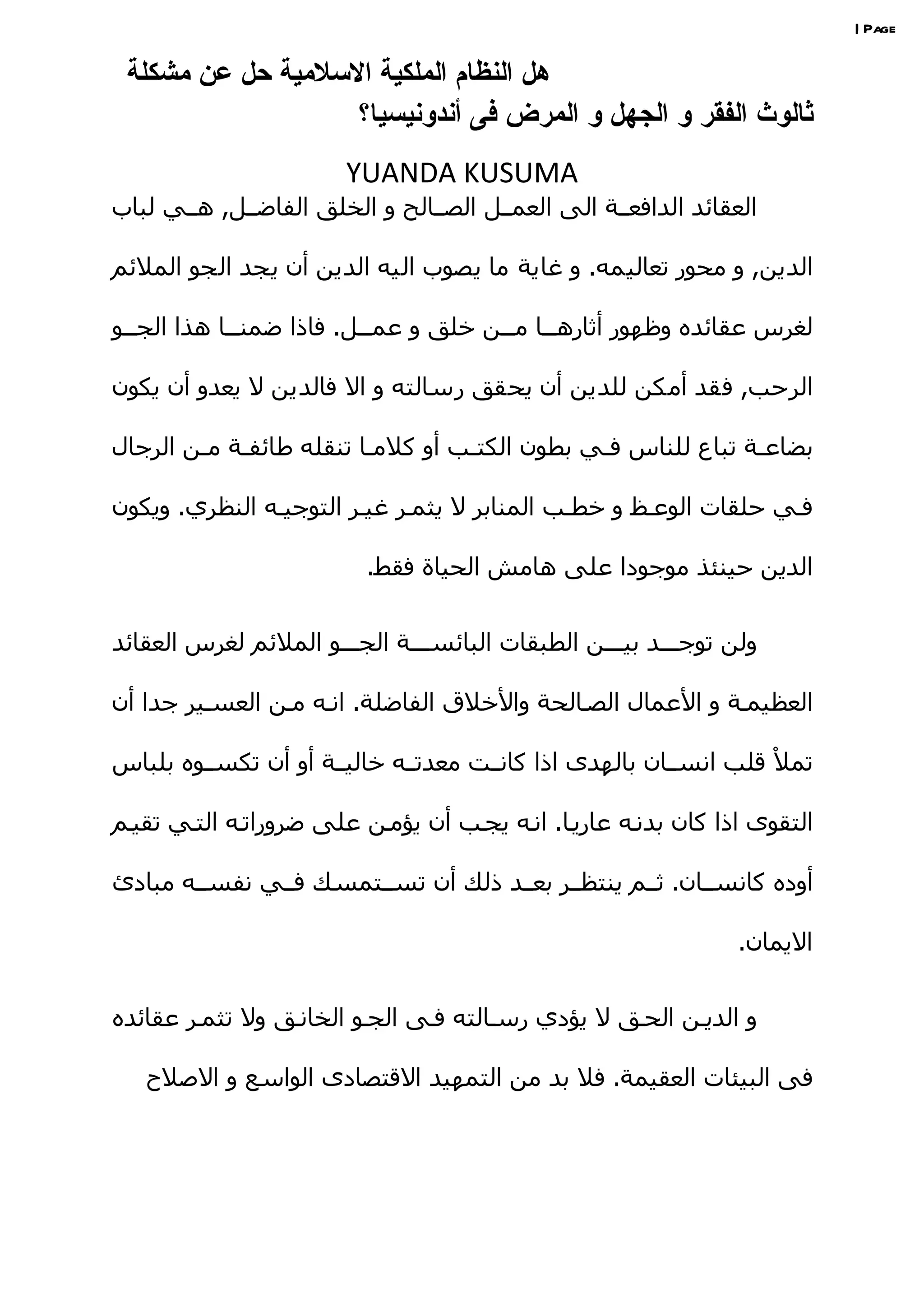 تناقش الوثيقة فكرة النظام الملكي السلمي كحل لمشكلة ثالوث الفقر والجهل والمرض في أندونيسيا، حيث تشير إلى أن حل هذه المشكلات يتطلب تمهيد اقتصادي واجتماعي. تؤكد على أن الدين لا يمكن أن يؤدي رسالته في البيئات العقيمة، ويستعرض أهمية تنظيم الملكية وتوزيع الثروة العادلة كوسيلة لتحقيق الاستقرار. كما تقترح أن تطبيق هذا النظام يمكن أن يقلل من نسبة الجرائم بشكل كبير.