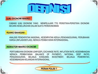 The document discusses macroeconomics theory and defines it as the study of overall economic events in an economy. It covers topics like national income analysis, employment opportunities, price changes, and international balance of payments. Key macroeconomic indicators include economic growth, exchange and inflation rates, balance of payments, national debt ratio, unemployment, consumption, investment, and government spending. Models of economic systems with government intervention are presented, along with the development of Indonesia's economy from the Old Order to Reform Era. Challenges facing the economy like high costs, income disparities, and policy changes are also summarized.