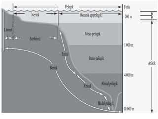 Dokumen tersebut merangkum berbagai jenis ekosistem perairan beserta ciri-cirinya, seperti ekosistem laut (terumbu karang, lamun), air tawar (waduk, sungai, danau), serta ekosistem pesisir (mangrove, estuaria). Dijelaskan pula faktor-faktor pendukung yang memungkinkan berlangsungnya ekosistem perairan tersebut.