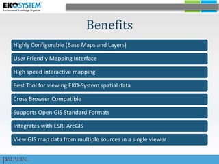The document outlines the features and benefits of the eko-system web map viewer, highlighting its configurability for base and feature layers, user-friendly interface, and speed. It emphasizes compatibility with various browsers and support for open GIS standards, including ESRI integration and REST APIs. Additionally, it references key technologies and specifications related to GIS and web services.