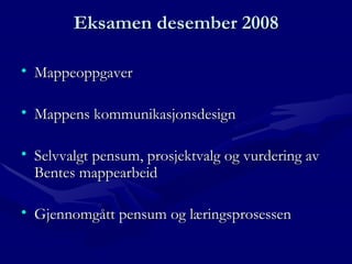 Eksamen desember 2008Mappeoppgaver Mappens kommunikasjonsdesign Selvvalgt pensum, prosjektvalg og vurdering av Bentes mappearbeid Gjennomgått pensum og læringsprosessen