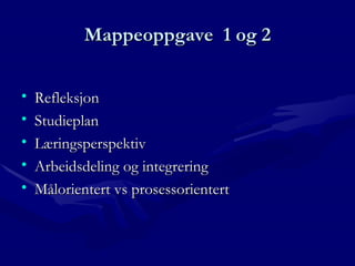 Mappeoppgave 1og 2 Refleksjon Studieplan Læringsperspektiv Arbeidsdeling og integrering Målorientert vs prosessorientert