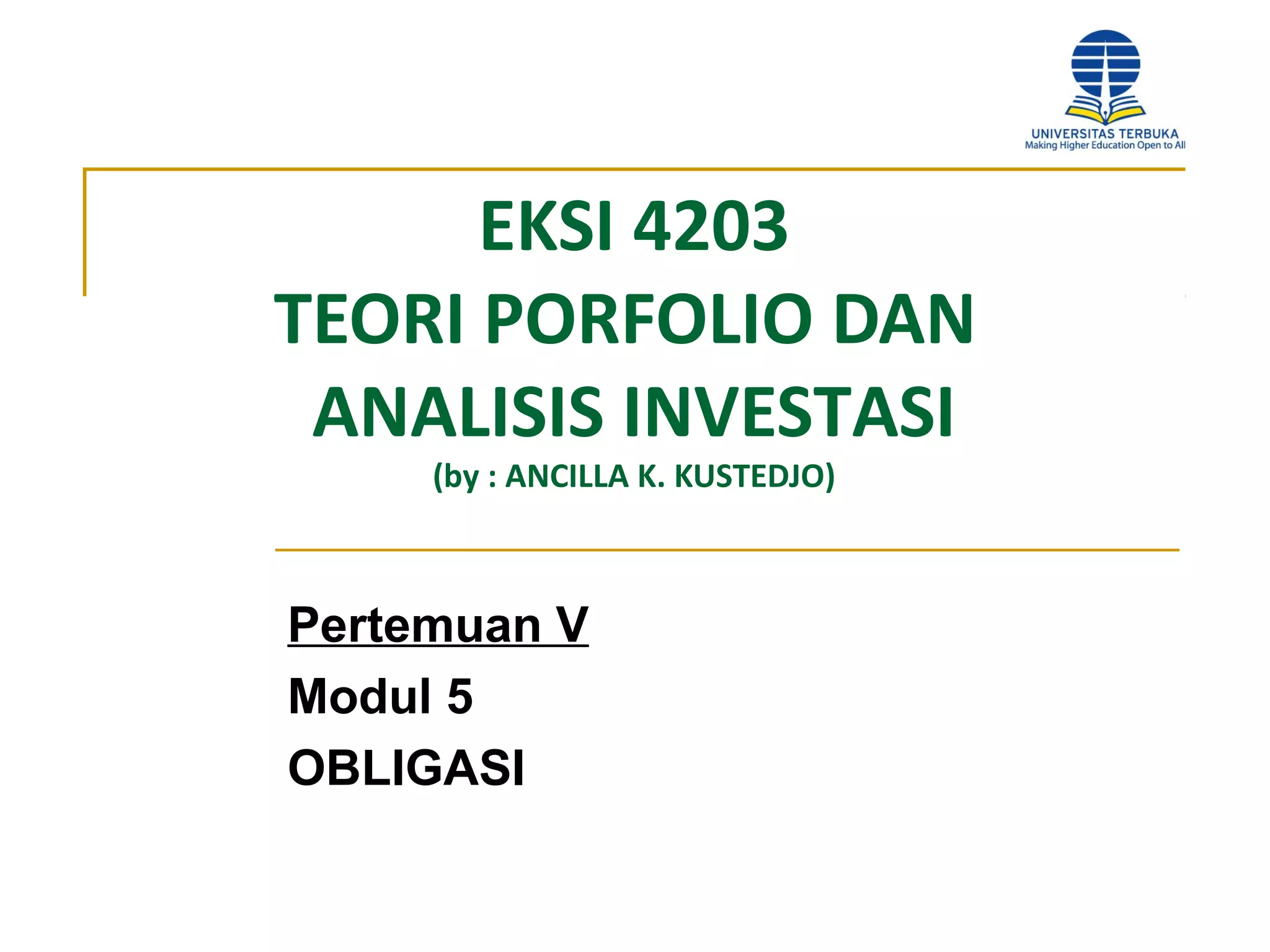Obligasi adalah sekuritas yang diterbitkan oleh perusahaan atau pemerintah yang memberikan pembayaran bunga berkala dan pokok pinjaman pada saat jatuh tempo. Terdapat berbagai karakteristik dan jenis obligasi seperti yield, kupon, dan jaminan. Analisis investasi obligasi melibatkan pengukuran yield seperti yield sampai jatuh tempo, yield sampai dibeli kembali, dan yield yang terealisasi.