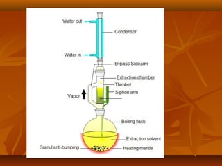 Ekstraksi adalah pemisahan suatu zat dari sampel berdasarkan kelarutannya pada pelarut tertentu. Teknik ekstraksi digunakan untuk pemisahan cepat dan bersih baik untuk analisis maupun pekerjaan preparatif. Terdapat dua jenis ekstraksi utama yaitu ekstraksi cair-cair yang menggunakan pelarut dan ekstraksi padat-cair menggunakan soxhlet. Pemilihan pelarut yang tepat dipengaruhi oleh faktor se