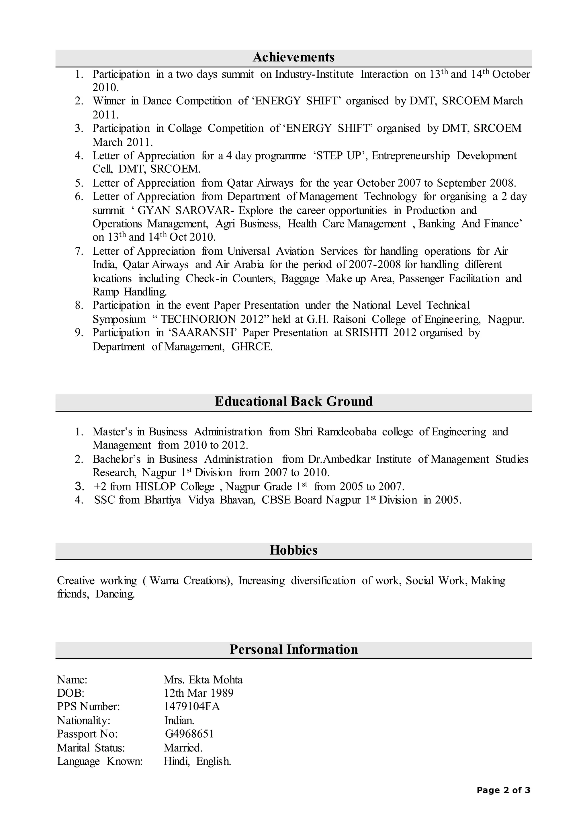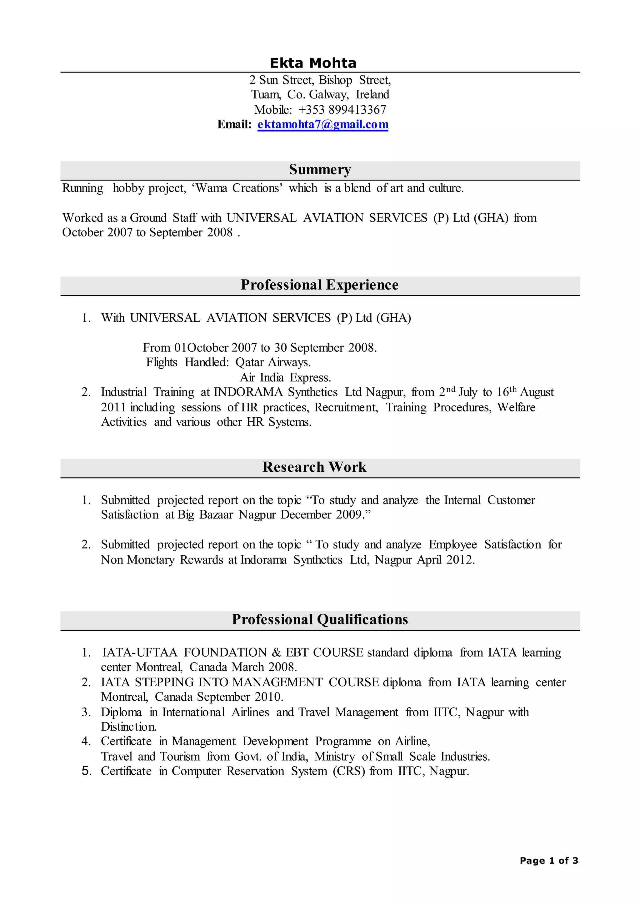 Ekta Mohta has experience working as ground staff for Universal Aviation Services from 2007 to 2008, handling flights for Qatar Airways, Air India Express, and others. She holds several qualifications in aviation management from IATA and business administration degrees. Her hobbies include her art and culture hobby project 'Wama Creations' and social work. She provides her contact information and educational and professional background in 3 pages.