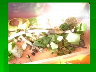 FEM UN TERRARIDE CARGOLS! COM FER UN TERRARI ? *CAPSA DE PLÀSTIC *SORRA *BRANQUES I PEDRES *PLANTES *DE 5 A 10 CM DE SORRA *CAL REGAR AMB PULVERITZADOR *FULLES D’ENCIAM , ESPINACS… *CALCI PER LES CLOSQUES DELS CARGOLS ( OUS TRENCATS)