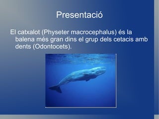 Presentació El catxalot(Physeter macrocephalus) és la balena més gran dins el grup dels cetacis amb dents (Odontocets). - 3.