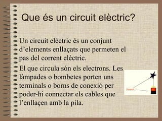 Que és uncircuit elèctric? Un circuit elèctric és un conjunt d’elements enllaçats que permeten el pas del corrent elèctric. El que circula són els electrons. Les làmpades o bombetes porten uns terminals o borns de conexió per poder-hi connectar els cables que l’enllaçen amb la pila.