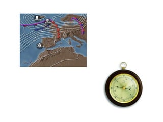 La pressió atmosfèricaés l força que exerceix l’aire situat sobre una determinada zona o regió de la superfície. En la pressió atmosfèrica hi influeixen sobre tot: L’altitud. A més altura, la quantitat d’aire que hi ha disminueix, i per tant la pressió atmosfèrica minva. La temperatura. Quan l’aire s’escalfa, pesa menys que quan és fred. Per aquest motiu, l’aire calent fa menys pressió. Les variacions en la pressió atmosfèrica produeixen dos tipus de situacions: Els anticiclons. Són zones de l’atmosfera on la pressió de l’aire és elevada. Les zones anticiclòniques solen tenir un temps atmosfèric sec i estable. Les depressions. Són zones de l’atmosfera on la pressió de l’aire és baixa. Les zones amb depressions tendeixen a tenir un temps atmosfèric inestable. El baròmetre és l’aparell que fem servir per mesurar la pressió atmosfèrica LA PRESSIÓ ATMOSFÈRICA