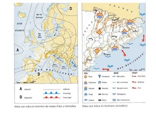 Els mapes deltemps ens indiquen quin temps atmosfèric ha fet o farà en una determinada zona geogràfica. Reflecteixen la informació obtingudes a partir de les seves observacions i de les dades recollides per les sondes, els satèl·lits i observatoris meteorològics. Entre els mapes del temps, n’hi ha que indiquen el moviment de les masses d’aire a l’atmosfera. En aquests mapes es distingeixen element com: Les isòbares, que són unes línies que uneixen punts que tenen la mateixa pressió atmosfèrica. Les zones de depressió, que s’assenyalen amb la lletra D. Les zones d’anticicló, que s’assenyalen amb la lletra A. Els fronts de masses calent i fred. Altres mapes destaquen els fenòmens atmosfèric que s’han produït o els que es poden produir en una zona determinada, com la nuvolositat, l’estat del mar, els vents, les precipitacions, les temperatures, etc... Els mapes del temps