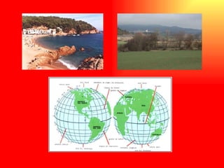 Els factors delclima A la terra hi ha una gran varietat de climes. Aquesta variació és el resultat de la influència de diversos factors. Per exemple: La latitud , que és la distància des de qualsevol punt fins a l’equador. Com més gran és la distància d’un punt a l’equador, hi ha menys insolació i, per tant, hi fa més fred. Així, les zones de climes càlids són les properes a la zona equatorial; en canvi, les zona de climes més freds són a prop dels pols. L’altitud ,que és l’altura a què es troba un lloc respecte al nivell del mar. A mesura que augmenta l’altitud, la temperatura disminueix. Per aquest motiu, als cims de les muntanyes normalment fa més fred que a les planes i a les valls. L’orientació dels vessants de les muntanyes. A l’hemisferi nord , els solells o vessants orientats cap el sud són més càlids que els obacs,que estan orientats cap al nord. La distància del mar . L’aigua del mar, per la seva capacitat d’absorbir i emmagatzemar calor, contribueix a fer que les zones situades a prop de la costa tinguin temperatures més suaus que les situades terra endins.