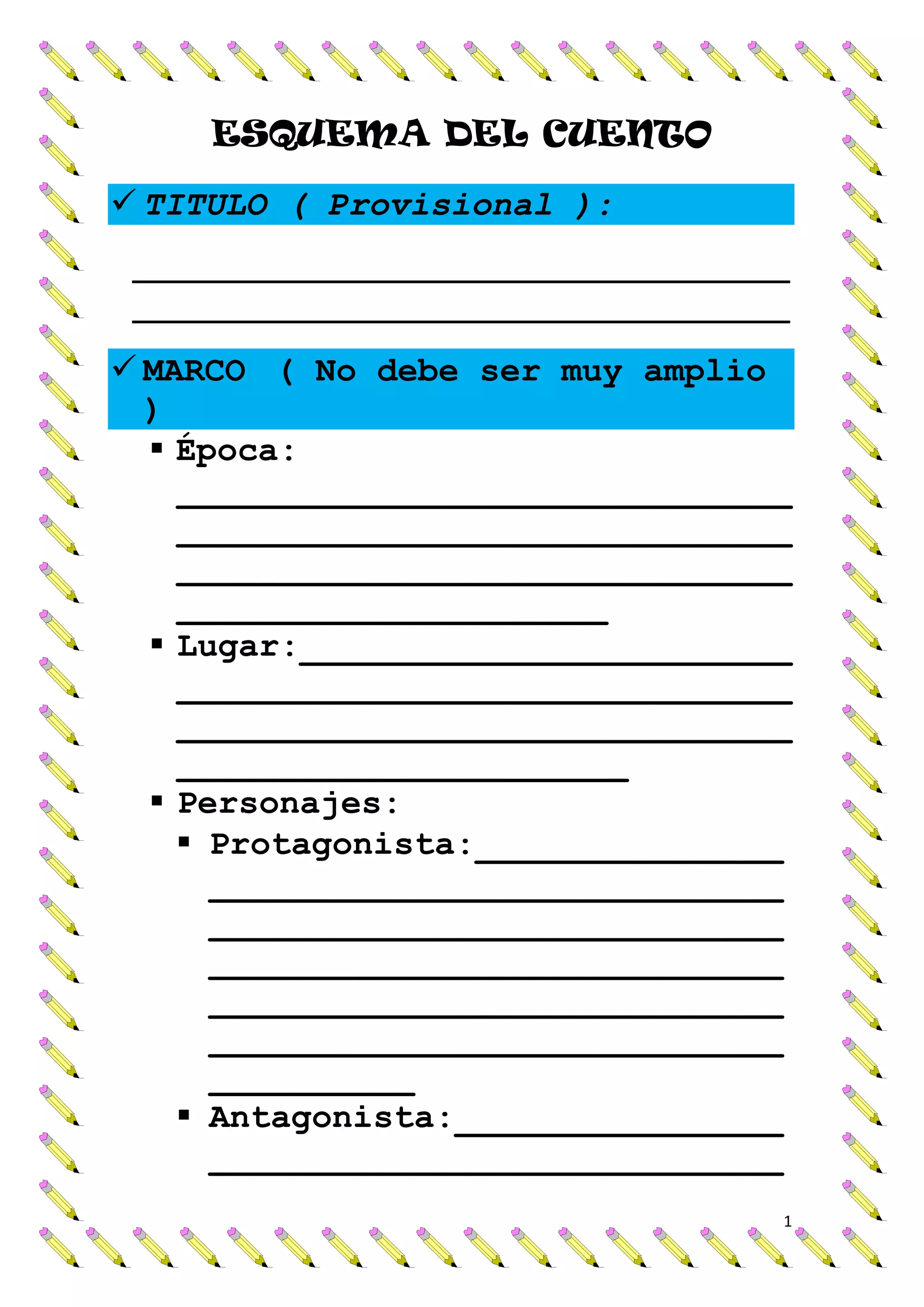 The document outlines the structure for a short story, including sections for the title, setting, characters, episode, and conclusion. The episode section describes a difficulty that arises, the protagonist's actions to resolve it, and the ultimate solution. Character details and specifics of the plot are left unspecified.