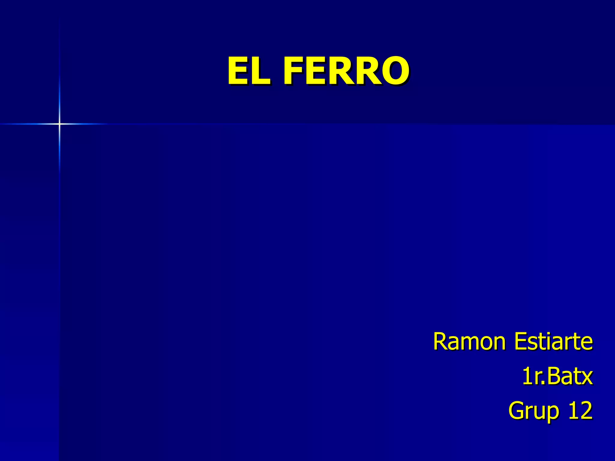 INTRODUCCIÓ Fe: element químic, nombre atòmic 26, grup 8 Metall de transició que junt amb Ni i Co forma el grup de les tríades Material més abundant (5%) a escorça terrestre (dels metalls només l’Al és més abundant) i un dels elements més importants de l’Univers El nucli de la Terra està format per Fe fos i Ni, generant quan es mou un camp magnètic. El Fe pur no té gaires aplicacions industrials: resistència baixa alta tendència a la corrosió