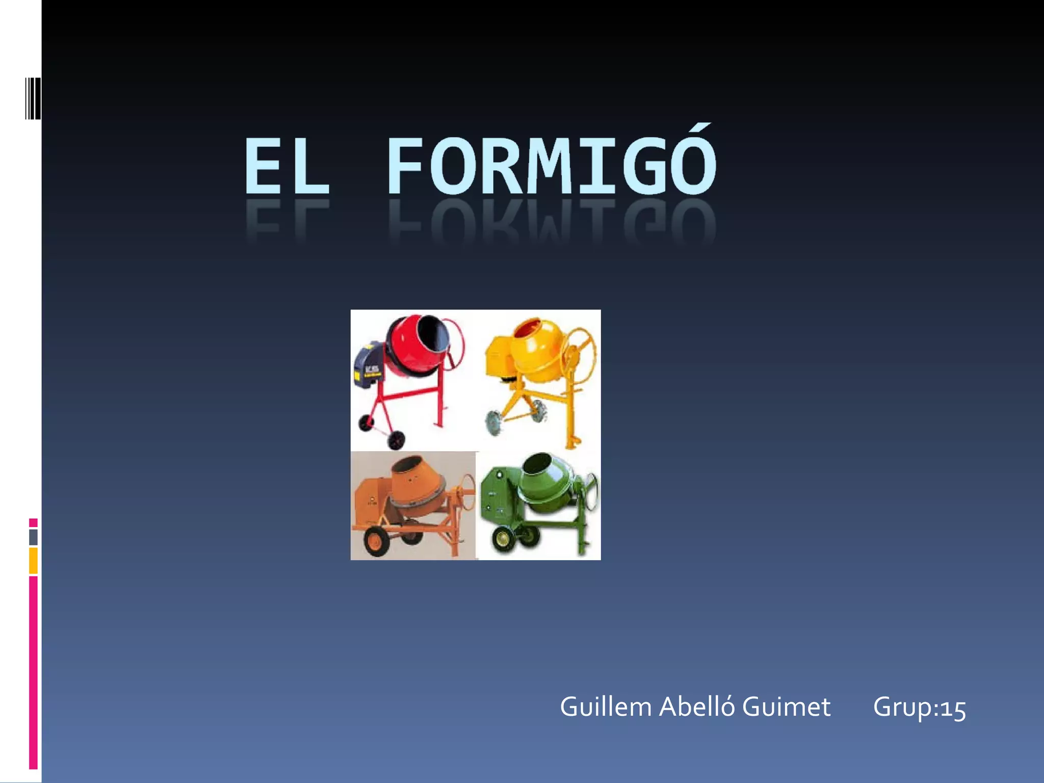 HISTÒRIA No esté una certesa absoluta de quan es va descobrir o inventar el formigó, hi ha força hipòtesis. El més provable és que fou inventat a la prehistòria ja que s’han trobat terres de vivendes fets d’un formigó rupestre. Més tard vingueren les grans civilitzacions com l'egípcia (piràmide de keops), la grega (temples), la romana (el coliseu) y la maia (piràmides maies) que l’utilitzaren amb les seves monumentals construccions. El formigó ha anat evolucionant constantment a la història i el seu ús cada cop ha estat més gran. Però el seu avanç més gran a la història fou a la revolució industrial on el seu ús es disparà, juntament amb la invenció del formigó armat. Avui en dia el paper que juga el formigó a la societat és importantíssim sobretot en el món de la construcció.