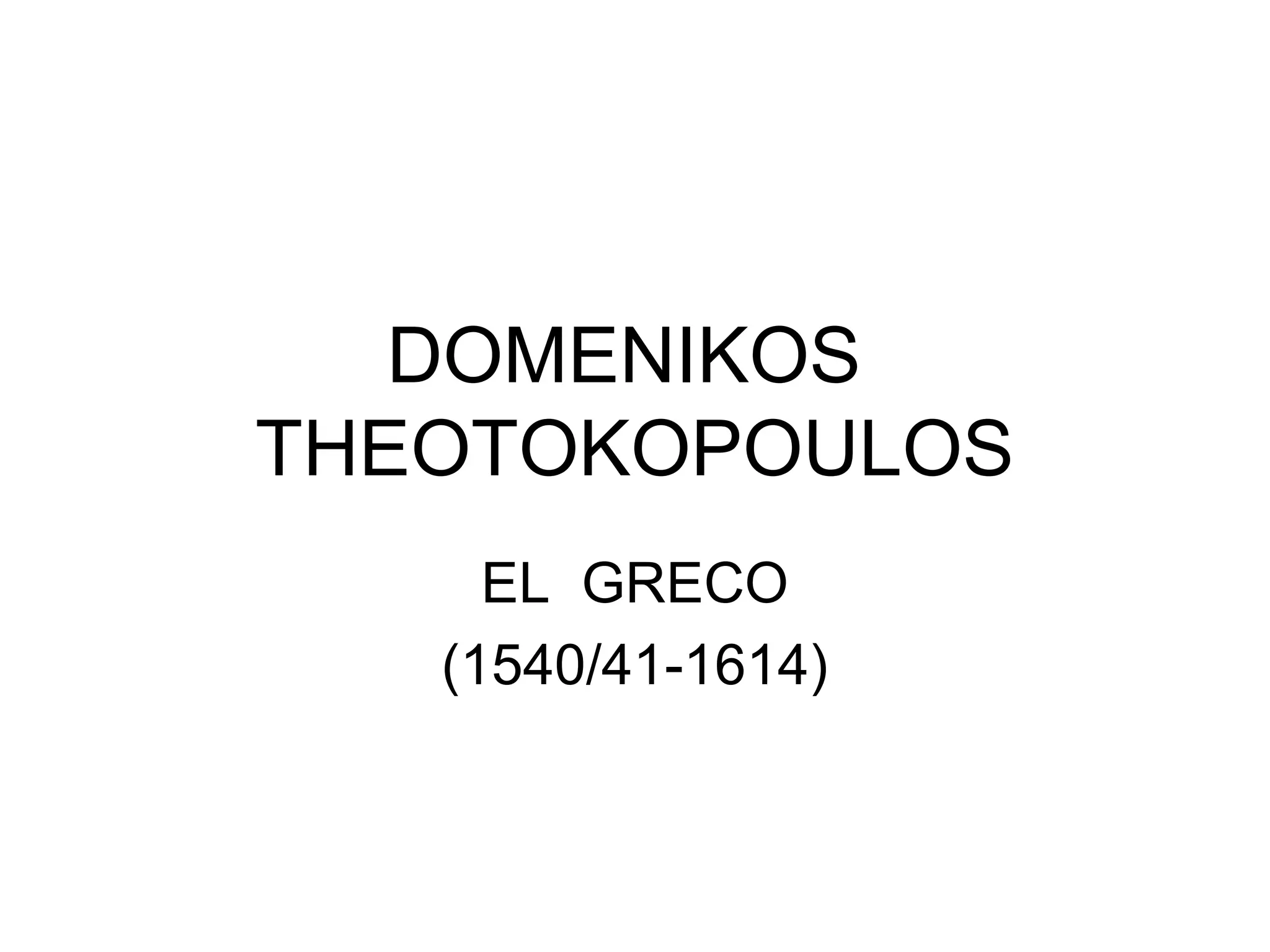 El Greco, rođen Domenikos Theotokopoulos, bio je grčki slikar koji je djelovao prvenstveno u Španjolskoj, nakon što je radio u Italiji pod utjecajem Tiziana i Tintoretta. Njegova djela prepoznatljiva su po izduženim likovima, neobičnim bojama i kombinaciji ekspresionizma i nadrealizma, a također se ističu njegovim bizantskim korijenima. Unatoč tome što je bio podcijenjen nakon svoje smrti, El Greco je kasnije postao utjecajan kao jedan od prethodnika modernih umjetničkih pokreta.