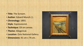 The Scream is a famous 1893 painting by Norwegian artist Edvard Munch. It depicts a figure with hands raised to its head against a landscape in distressing colors. There are four versions of the painting, with one in the National Gallery in Oslo. The painting uses expressionist techniques like distorted shapes, strong colors, and lines to convey personal fear and anxiety in modern society. Munch was an important early expressionist known for works exploring illness, death, and pain through vivid colors and figures. Expressionism in art more broadly aimed to distort reality and convey modern feelings through experimental use of materials.