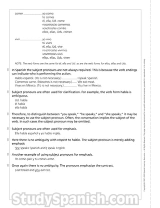 This document provides information on conjugating regular verbs in Spanish. It begins by listing Spanish subject pronouns and then explains how to conjugate -ar, -er, and -ir verbs by dropping the infinitive ending and adding the appropriate termination. It emphasizes memorizing the conjugations of three model verbs - hablar, comer, and vivir. The document also discusses using subject pronouns and provides examples of their use. It concludes by listing additional common regular verbs to practice conjugating.