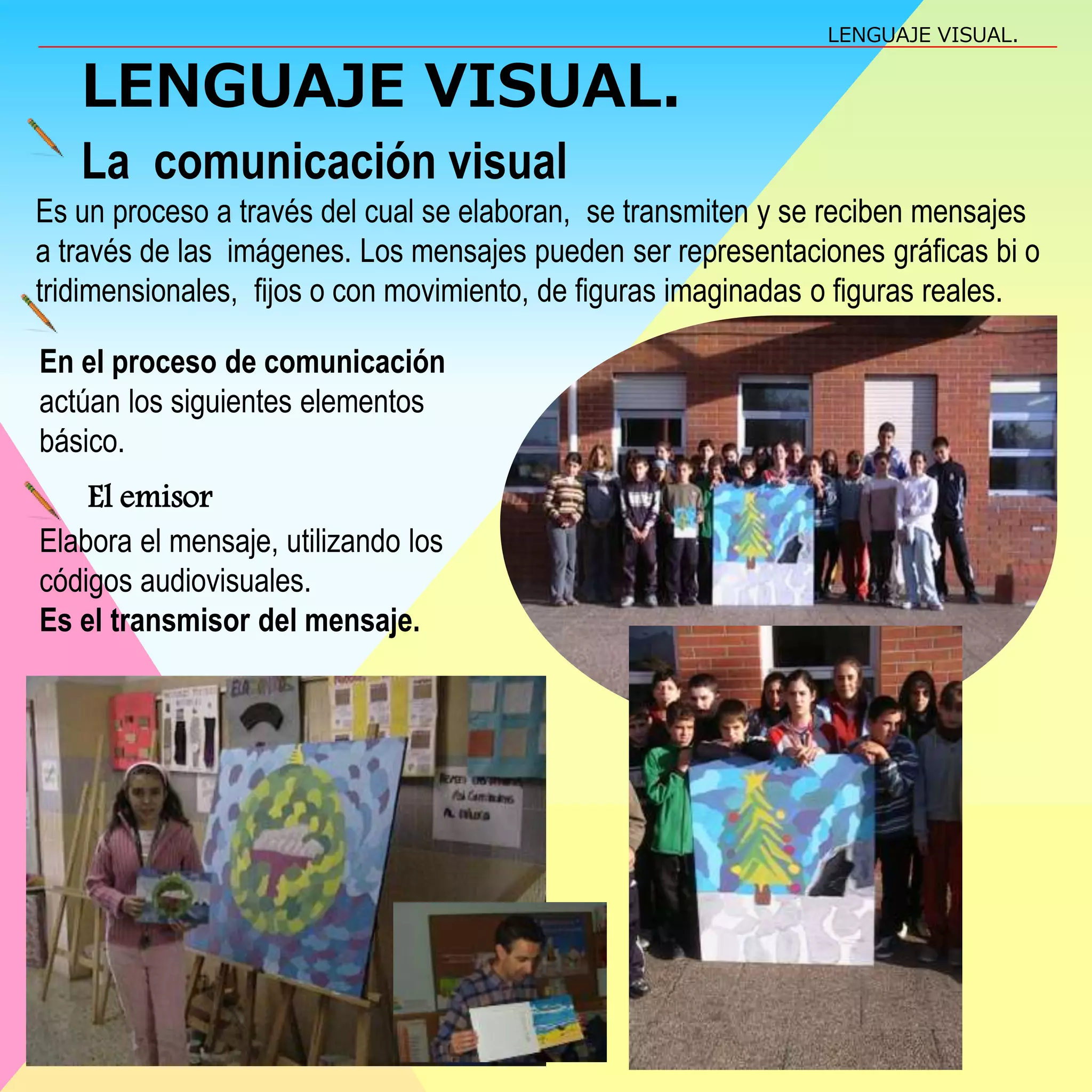 El documento describe los conceptos fundamentales del lenguaje visual, incluyendo el emisor, mensaje, canal, código y receptor. Explica que la comunicación visual es un proceso a través del cual se transmiten y reciben mensajes visuales que pueden ser imágenes fijas o en movimiento. También cubre los tipos de lenguajes visuales como objetivo, artístico y publicitario, así como las funciones de las imágenes como referencial, emotiva y conativa.