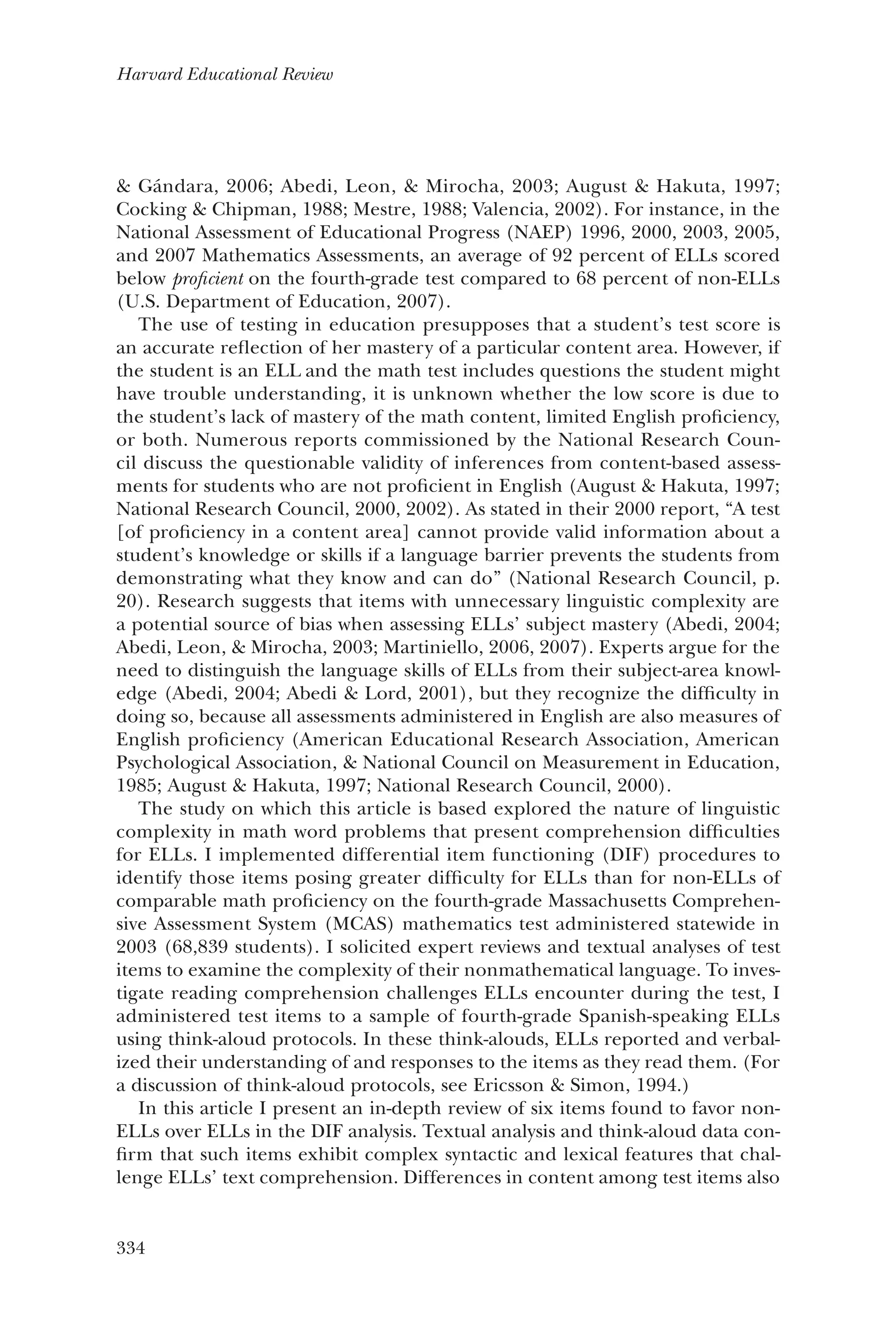 This document summarizes a study that analyzed the linguistic complexity of math word problems on the Massachusetts Comprehensive Assessment System (MCAS) fourth-grade math test. It found that problems with greater linguistic complexity posed disproportionate difficulty for English Language Learners (ELLs) compared to non-ELLs of equivalent math ability. The study identified problems through statistical analysis that favored non-ELLs, then analyzed the linguistic features and had Spanish-speaking ELLs think aloud while solving the problems to understand the comprehension challenges. The document reviews research on the impact of linguistic factors like vocabulary, syntax, sentence length on reading comprehension and performance differences between ELLs and non-ELLs.