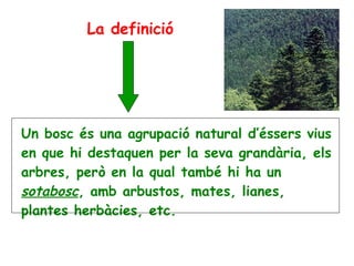 La definició Unbosc és una agrupació natural d’éssers vius en que hi destaquen per la seva grandària, els arbres, però en la qual també hi ha un sotabosc , amb arbustos, mates, lianes, plantes herbàcies, etc.