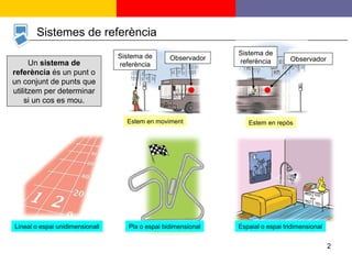 Sistemes de referènciaLineal o espai unidimensionall Pla o espai bidimensional Espaial o espai tridimensional Un sistema de referència és un punt o un conjunt de punts que utilitzem per determinar si un cos es mou. Estem en moviment Estem en repòs Sistema de referència Observador Sistema de referència Observador