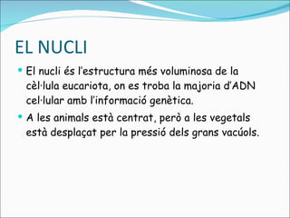 EL NUCLI Elnucli és l’estructura més voluminosa de la cèl·lula eucariota, on es troba la majoria d’ADN cel·lular amb l’informació genètica. A les animals està centrat, però a les vegetals està desplaçat per la pressió dels grans vacúols.