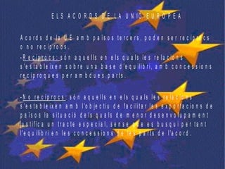 Instruments que financenl'accio de la UE Els instruments que financen l'acció de la UE són: - El fons de desenvolupament : Instrument principal per a l'ajuda i la cooperació al desenvolupament i té com a objectiu reduir la pobresa i contribuir al desenvolupament econòmic , social i cultural dels països. - Instruments de finançament de la cooperació al desenvolupament: L'objectiu és erradicar la pobresa mitjançant la democràcia, el bon govern i el respecte dels drets humans. - Instrument financer de veïnatge i partenaritat: Dona suport al desenvolupament d'una àrea de prosperitat i de bones relacions de veïnatge entre la UE i els països “socis”.