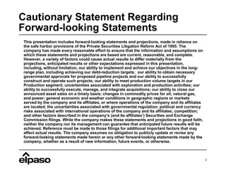 John Hopper presented at the Deutsche Bank High Yield Conference on September 28, 2005. The presentation summarized El Paso Corporation's progress in turning around its business, reducing debt, and positioning itself for future growth. Key points included stabilizing production, focusing more investment onshore, improving the Texas Gulf Coast business, and having significant leverage to rising natural gas prices in 2006. Cost reductions were also continuing across the company. The presentation demonstrated that El Paso had made rapid progress in its turnaround.