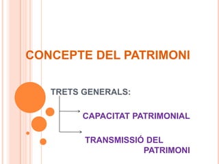 1. concepteQUÈÉS EL PATRIMONI?Conjunt de relacions jurídiques, siguin actives (drets) o passives (obligacions),que formen l’esfera patrimonial de la persona.