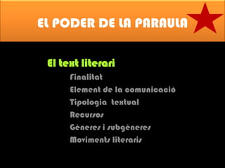 Una presentació per a introduir la literatura catalana al batxillerat. Es planteja a partir de la tipologia textual i la teoria de la comunicació i es tracta de manera molt àmplia el que és el text poètic: acudits, rodolins, cançons, gloses...