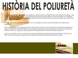 A la dècadadels 30's, Otto Bayer , qui dirigiria en aquell moment el Departament d'Investigació de Bayer, volia trobar una fibra sintètica similar a la poliamida que havia estat descoberta a USA. Otto Bayer va considerar com a grup reactiu apropiat el isocianat , que té la facultat d'entrar en reacció amb alcohols per a donar lloc a la formació de uretans . Al 1941, arran d'un experiment fracassat, es va aconseguir col·locar la primera pedra de l'aplicació de poliuretans. Però els tecnològics aconseguirien donar molt prompte amb la causa d'aquesta formació de bombolles: en alguns polièsters es trobaven presents encara grups carboxílics que reaccionaven amb els grups isocianats formant, al seu torn, grups de carboxamida amb despreniment simultani d'anhídrid carbònic. Llavors es va assolir ,quan es va provocar molt conscientment aquesta separació d'anhídrid carbònic i per tant, la formació d'escuma (despumació) mitjançant l'addició de petites quantitats d'aigua. HISTÒRIA DEL POLIURETÀ