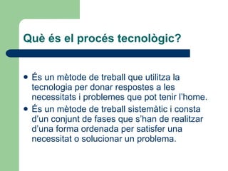 Què és elprocés tecnològic? És un mètode de treball que utilitza la tecnologia per donar respostes a les necessitats i problemes que pot tenir l’home. És un mètode de treball sistemàtic i consta d’un conjunt de fases que s’han de realitzar d’una forma ordenada per satisfer una necessitat o solucionar un problema.