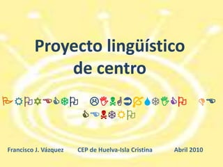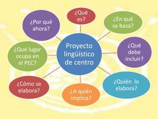 Este documento describe un proyecto lingüístico de centro, que es un conjunto de acuerdos sobre la enseñanza y uso de idiomas en una escuela. Explica que el proyecto lingüístico forma parte del proyecto educativo de cada escuela y establece cómo se tratarán los idiomas en el plan de estudios. Además, detalla que el proyecto lingüístico es elaborado por un comité de profesores siguiendo un proceso de discusión y aprobación para establecer acuerdos que afectan a toda la escuela y cada