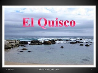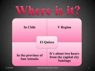 The document discusses travel options to El Quisco, Chile, two hours from Santiago, with choices of car or bus. It highlights local attractions such as the Mampato entertainments center, the Museo Colonial de El Totoral, and the Casa Museo Pablo Neruda. The content includes practical information for tourists, including rental cabins and a link to the local municipality's tourism page.