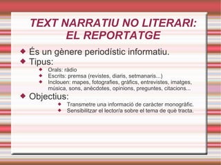 TEXT NARRATIU NOLITERARI: EL REPORTATGE És un gènere periodístic informatiu. Tipus: Orals: ràdio Escrits: premsa (revistes, diaris, setmanaris...) Inclouen: mapes, fotografies, gràfics, entrevistes, imatges, música, sons, anècdotes, opinions, preguntes, citacions... Objectius: Transmetre una informació de caràcter monogràfic. Sensibilitzar el lector/a sobre el tema de què tracta.