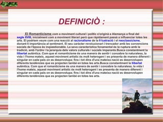 DEFINICIÒ : El Romanticisme com a moviment cultural i polític s'originà a Alemanya a final del segle XVIII , inicialment com a moviment literari però que ràpidament passà a influenciar totes les arts. El podríem veure com una reacció al racionalisme de la Il·lustració i el neoclassicisme , donant-li importància al sentiment. El seu caràcter revolucionari i trencador amb les convencions socials de l'època és inqüestionable. La seva característica fonamental és la ruptura amb la tradició, amb l'ordre i la jerarquia dels valors culturals i socials imperants.Busca constantment la llibertat autèntica. Com que el romanticisme és una manera de sentir i concebre la naturalesa, la vida i l'home mateix, aquest moviment artístic és molt heterogeni i es presenta de manera diferent i singular en cada país on es desenvolupa; fins i tot dins d'una mateixa nació es desenvolupen diferents tendències que es projecten també en totes les arts.Busca constantment la llibertat autèntica. Com que el romanticisme és una manera de sentir i concebre la naturalesa, la vida i l'home mateix, aquest moviment artístic és molt heterogeni i es presenta de manera diferent i singular en cada país on es desenvolupa; fins i tot dins d'una mateixa nació es desenvolupen diferents tendències que es projecten també en totes les arts.