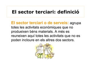 El sector terciari:definició El sector terciari o de serveis: agrupa totes les activitats econòmiques que no produeixen béns materials. A més es reuneixen aquí totes les activitats que no es poden incloure en els altres dos sectors.