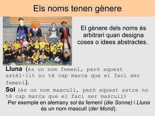 Els noms tenengènere El gènere dels noms és arbitrari quan designa coses o idees abstractes. Lluna ( és un nom femení, però aquest satèl·lit no té cap marca que el faci ser femení ). Sol (és un nom masculí, però aquest astre no té cap marca que el faci ser masculí) Per exemple en alemany sol és femení ( die Sonne) i Lluna és un nom masculí ( der Mond ).