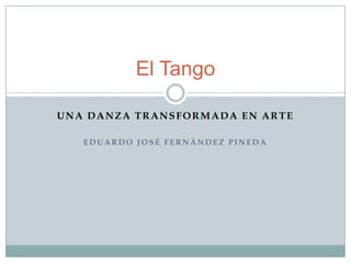 The document discusses the tango dance and how it transformed into an art form. Originally emerging in working class neighborhoods in Buenos Aires and Montevideo, the tango incorporated elements from African rhythms and European ballroom dances. Over time it developed its own musical identity and style and became a significant cultural export from Argentina.