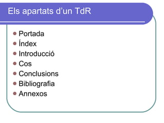 Els apartats d’unTdR Portada Índex Introducció Cos Conclusions Bibliografia Annexos