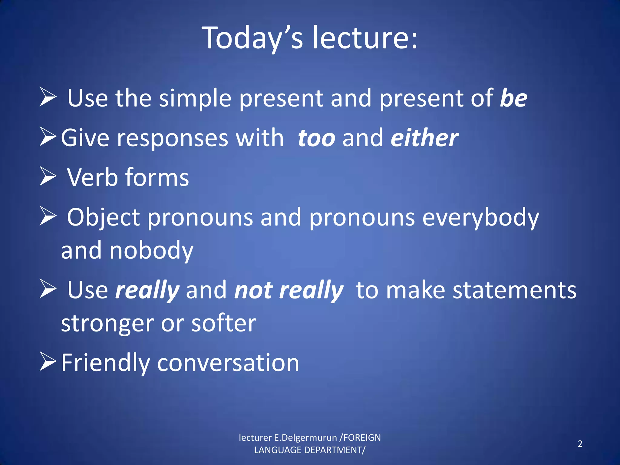 The lecture covered several topics related to English grammar, including the present tense and verb forms. It discussed using the simple present and present of be, giving responses with "too" and "either", object pronouns and pronouns like "everybody" and "nobody", and using modifiers like "really" and "not really". The lecture also covered personal pronouns, verb forms including the -ing form, and responded with encouragement to do homework.
