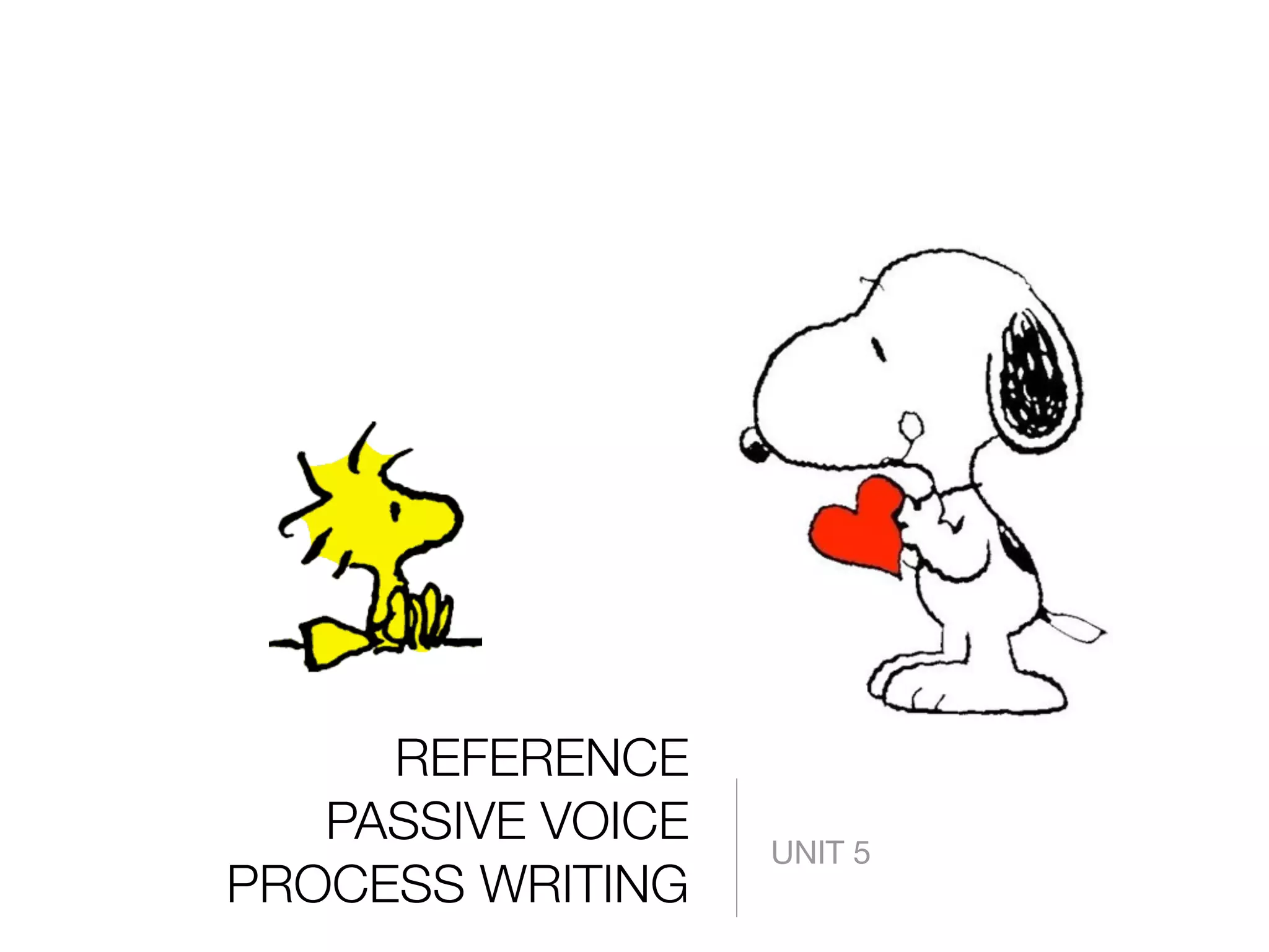 This document provides information on reference, passive voice, and process writing. It defines reference pronouns and gives examples of different types of pronoun reference, including subjective, objective, possessive, demonstrative, and relative pronouns. It also discusses how to avoid vague pronoun reference and how pronouns must agree in person and number. The document then explains passive voice and how it differs from active voice. It provides guidelines for when to use passive and active voice. Finally, it outlines the key components of organizing a process paragraph, including a topic sentence, steps in chronological order using transitions, and a concluding sentence.