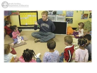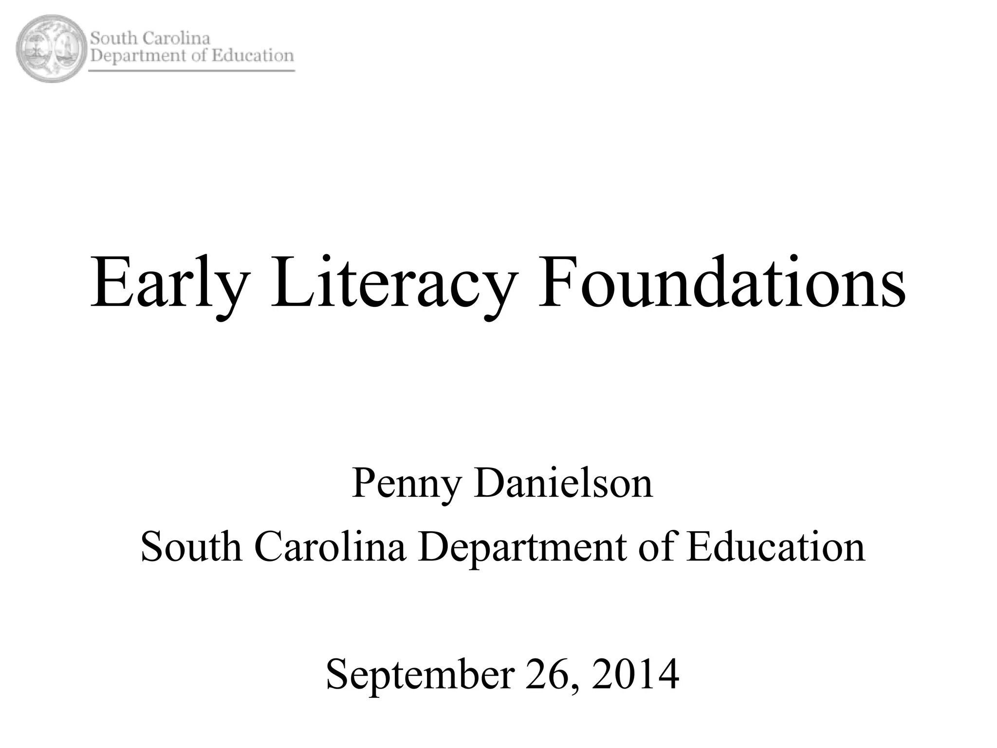 This document discusses early literacy research and strategies to strengthen early literacy skills in young children. It summarizes findings that show low-income children often enter kindergarten less prepared in early literacy skills like letter recognition and phonological awareness. Research also finds that preschool classrooms often do not devote enough time to developing oral language and other literacy skills. The document recommends strategies for developing skills in oral language, print awareness, alphabet knowledge, and phonological awareness to help prepare all children for success in kindergarten.