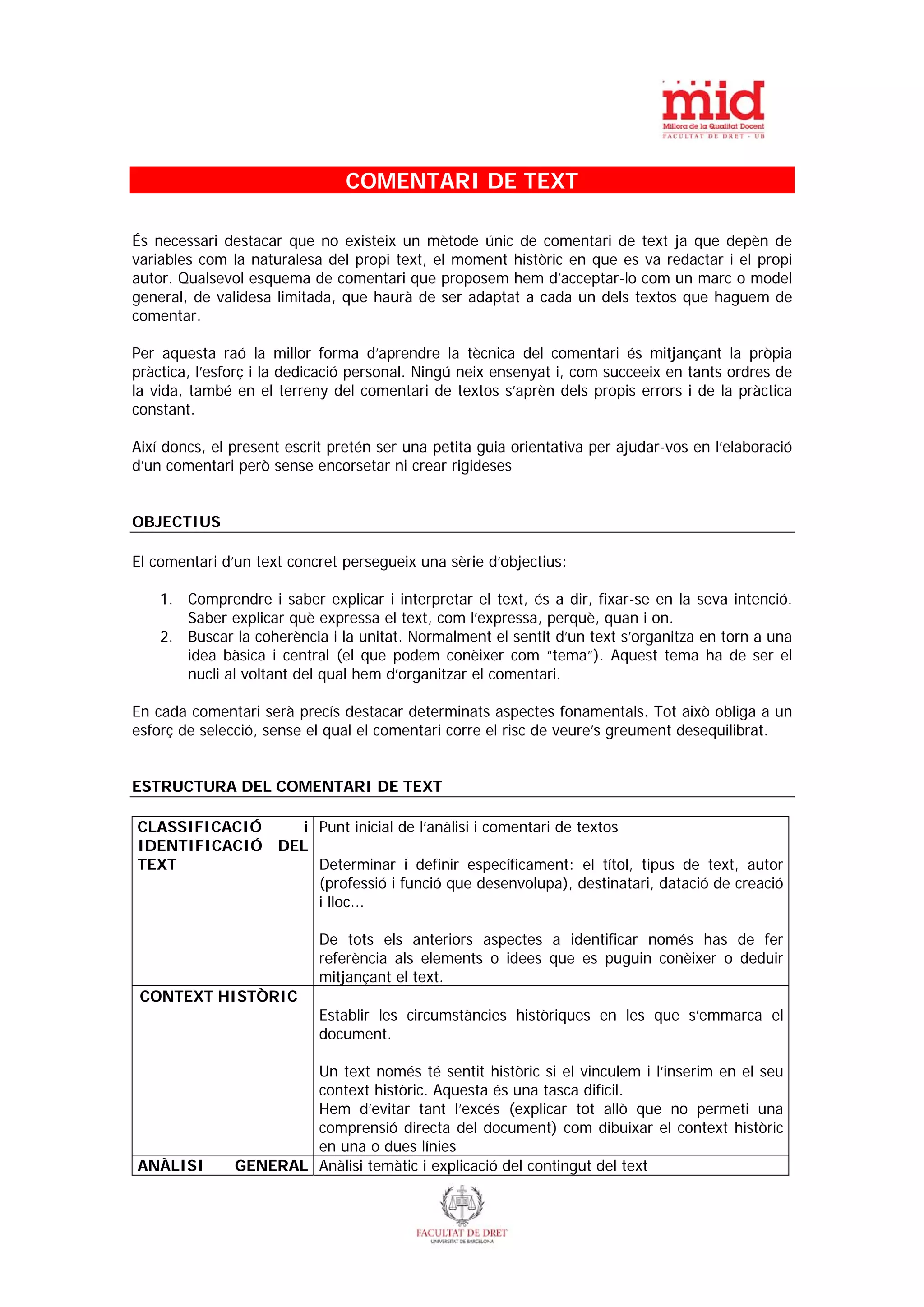 Ésnecessari destacar que no existeix un mètode únic de comentari de text ja que depèn de
