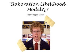 The document discusses the Elaboration Likelihood Model (ELM), which is a model of persuasion. The ELM explains that there are two routes through which persuasive messages are processed: the central route and the peripheral route. The central route involves a high level of receiver involvement and motivation to analyze the message carefully. The peripheral route involves low receiver involvement and uses things like catchy tunes, colors, and celebrity endorsements to grab attention without careful message analysis. The ELM helps determine what types of messages and techniques will work best for different audiences depending on their level of involvement in the topic.