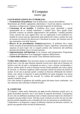 Il documento fornisce una panoramica sull'elaborazione automatica dei dati, discutendo il ruolo del computer e l'importanza di modelli matematici e algoritmi nella risoluzione di problemi. Viene sottolineato che il computer è uno strumento per l'esecuzione di sequenze logiche di operazioni, ma è privo di capacità decisionale, richiedendo quindi pianificazione e supervisione. Inoltre, il testo esplora l'architettura del computer, descrivendo le sue unità fondamentali e le operazioni che esegue nel trattamento delle informazioni.
